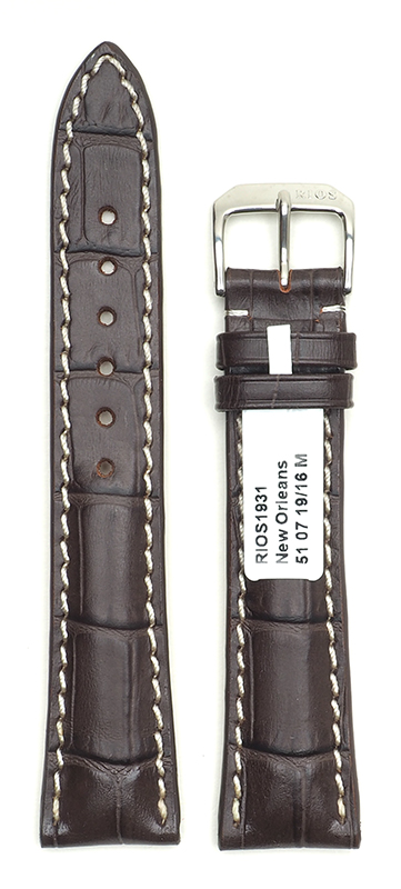 BeschreibungHerstellerBewertungen Beschreibung Kräftig bombiertes Uhrenarmband, Alligatorennarbung auf echt Rindsleder geprägt, matt, "Art Manuel", Naht chremeweiß FARBE 07 Mokka BAND- UND SCHLIESSENBREITE 19/16 mm BANDLÄNGE M = Herrenlänge: Lochteil 114 mm, Schließenteil 82 mm, Gesamtlänge 196 mm BANDSTÄRKE ca. 6,0 mm auf 3,0 mm verlaufend SCHLIESSE Edelstahl - vergoldete Schließe auf Wunsch Lieferfrist: ca. 7 Tage Hersteller Oswald Riemer Uhrenarmbandfabrik GmbHWillibald-Popp Str. 286179 AugsburgDeutschlandE-Mail: info@rios1931.de Bewertungen Geben Sie die erste Bewertung ab Es liegen keine Bewertungen vor