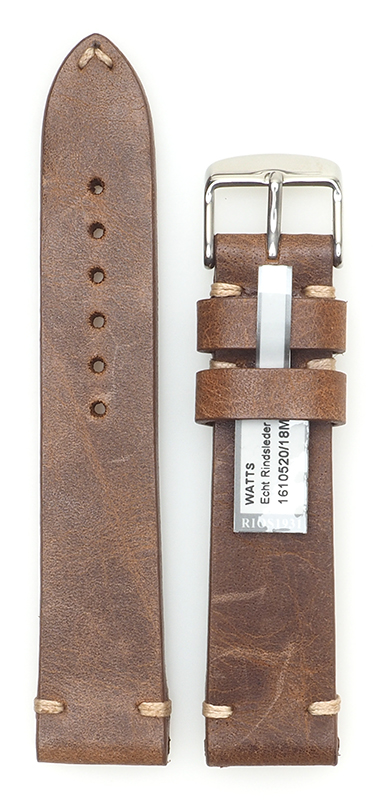 Ausdrucksstarkes Rindsleder, eckiger Querschnitt, handgenähter Riegelstich in Kontrastfarbe.